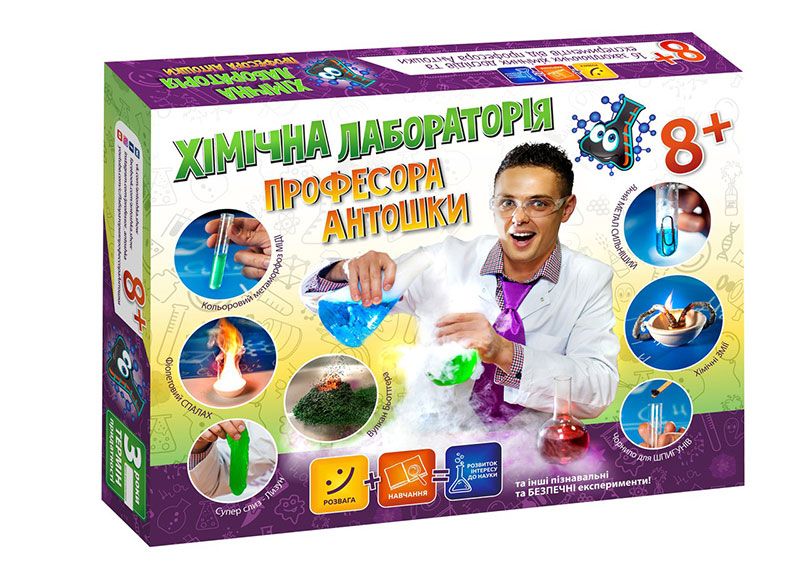 За допомогою набору «Хімічна лабораторія професора Антошки» 8+ ти зможеш провести найцікавіші експерименти! Ти дізнаєшся, як виростити хімічних змій та створити справжній вулкан, як приготувати чорнило для шпигунів та кольоровий метаморфоз міді, але головне – ти станеш справжнім ученим!